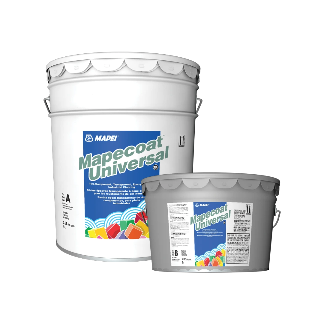 Mapecoat Universal [NA] is a two-component, high-gloss epoxy resin commonly used as a primer, intermediate coat, binder, and seal coat for industrial flooring.